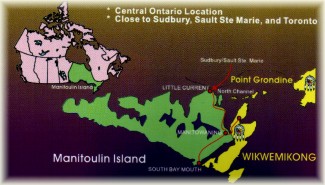 Point Grondine is isolated and accessible only by water or by float aircraft. It is characterized by a rocky shoreline and is considered a wilderness area used mostly by trappers, hunters and fishermen, as well as a navigational passage by all vessels.There are six satellite communities which surround the main village of Wikwemikong;.these include Rabbit Island, Murray Hill/Cape Smith, Wikwemikongsing, Kaboni, South Bay and Buzwah |